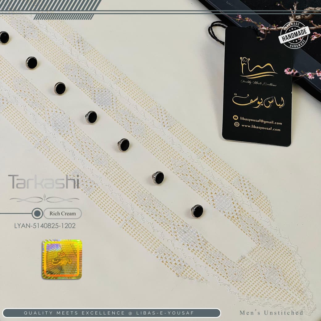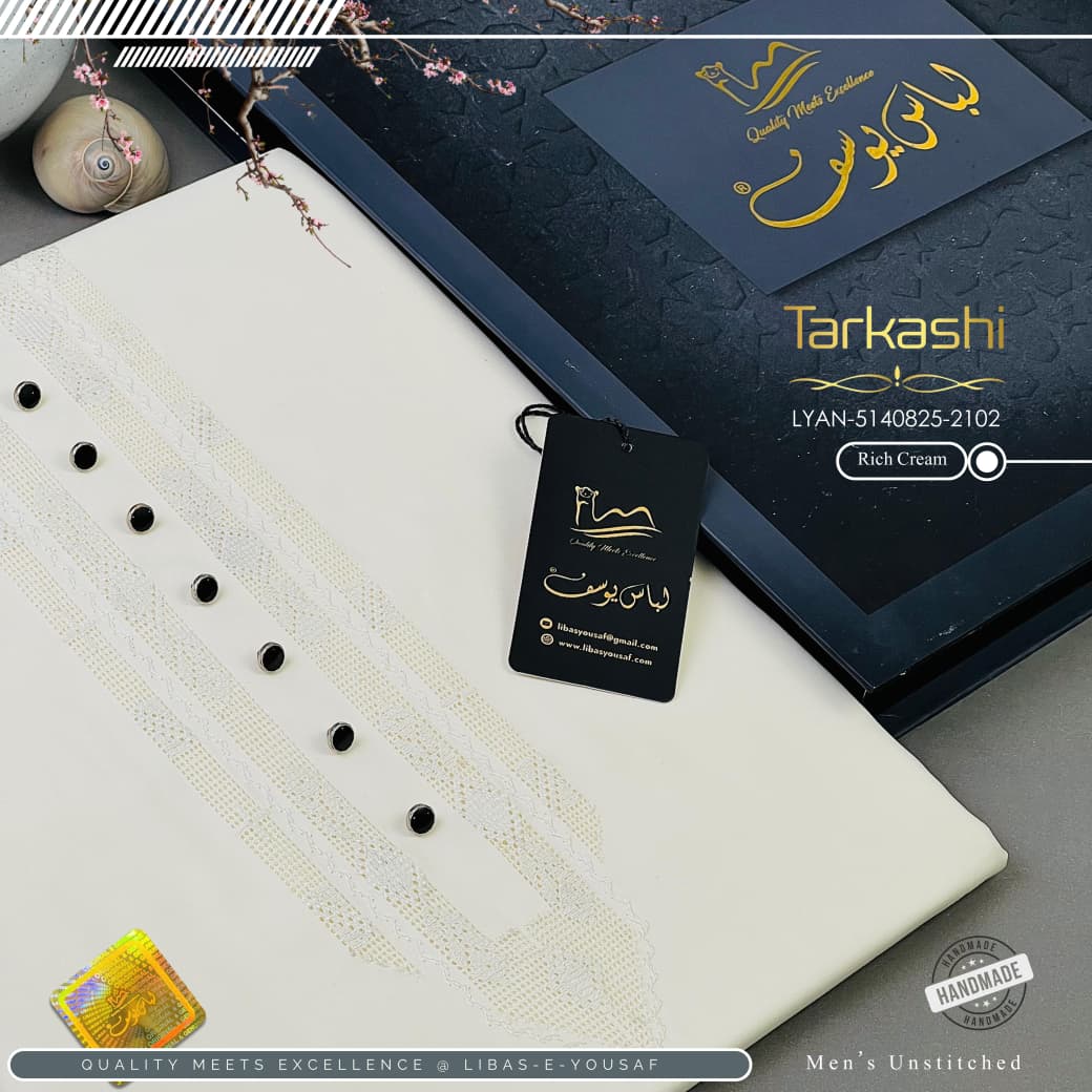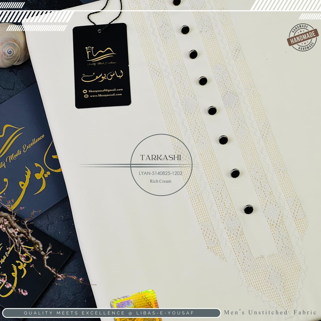 Presenting TarKashi, a distinguished hand-crafted unstitched men’s suit that harmonizes heritage artistry with contemporary elegance: