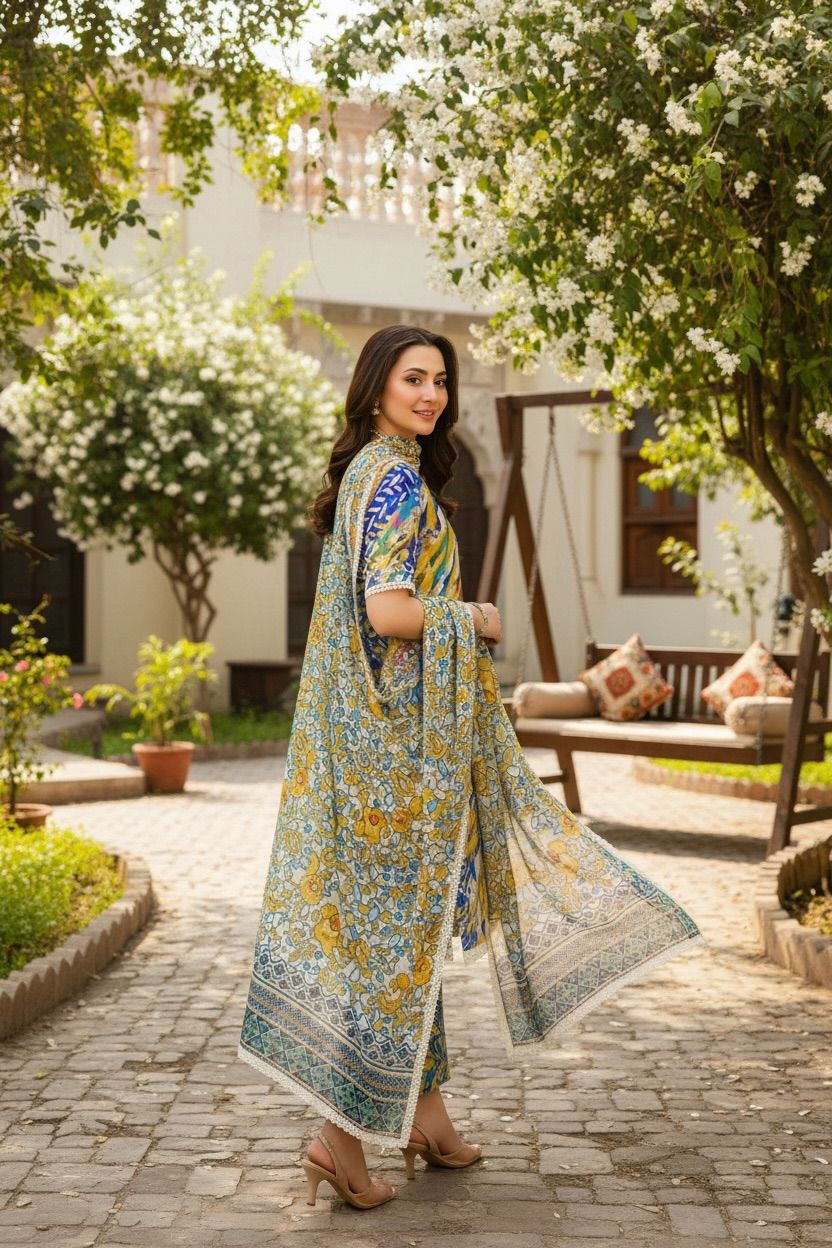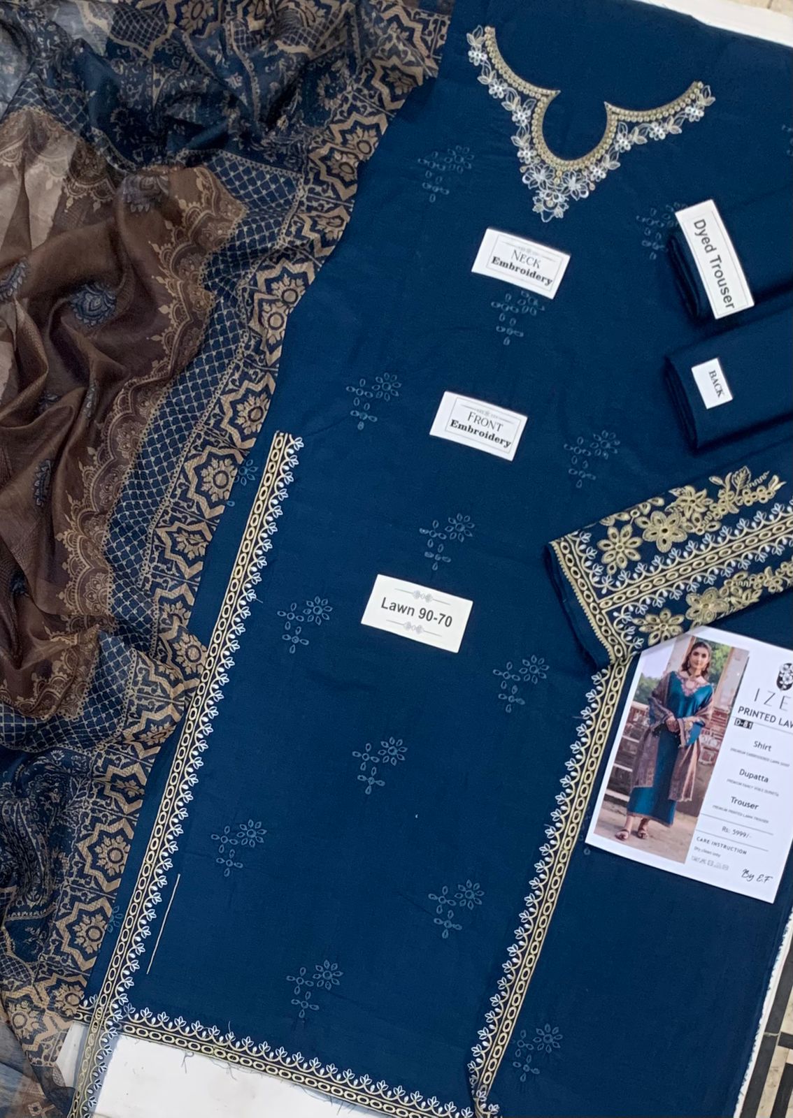IZEL – Premium Pure Lawn Suit | Heavy Embroidered Shirt with Digital Print Voil Dobby Dupatta